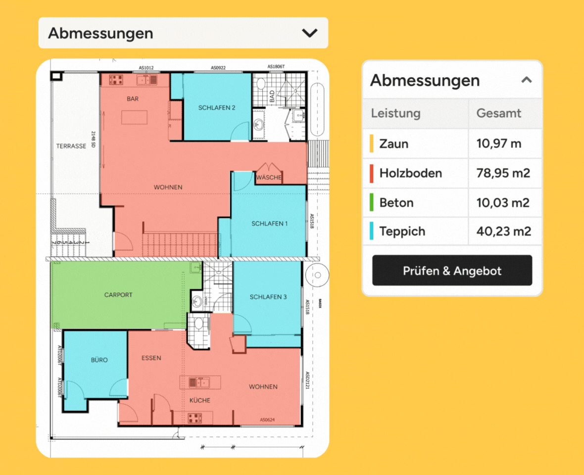 Mit dem Houzz Pro Planaufmaß ersetzen Sie ganz einfach Ihren gewohnten Prozess mit Papier, Dreikant, Taschenrechner und komplizierten Formeln, und verabschieden sich von der manuellen Aufmaßliste. Auf Grundlage von digitalen Planunterlagen erstellen Sie Ihr Aufmaß grafisch. Auch Abzüge für beispielsweise Fenster oder Türen sind kein Problem. Per Mausklick werden diese den entsprechenden Bauleistungen zugeordnet, sei es für die Arbeiten vom Maler, Fliesenleger, Elektriker oder Sanitär. Das Ganze funktioniert mit nur wenigen Klicks. Und das Beste: In Minutenschnelle übertragen Sie alle Massen in Ausschreibungsunterlagen, die Sie digital versenden können.