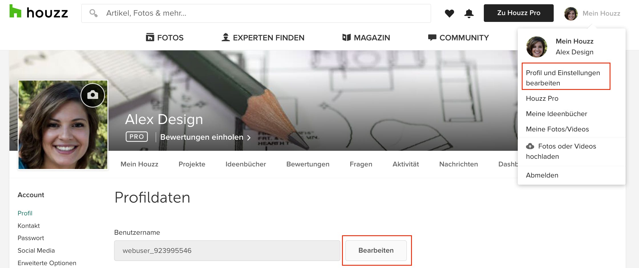 Gehen Sie in Ihrem Web-Browser auf houzz.de und melden Sie sich in Ihrem Profil an. Oben rechts auf der Seite hovern Sie mit der Maus auf „Mein Houzz“ und klicken Sie auf „Profil und Einstellungen bearbeiten“.