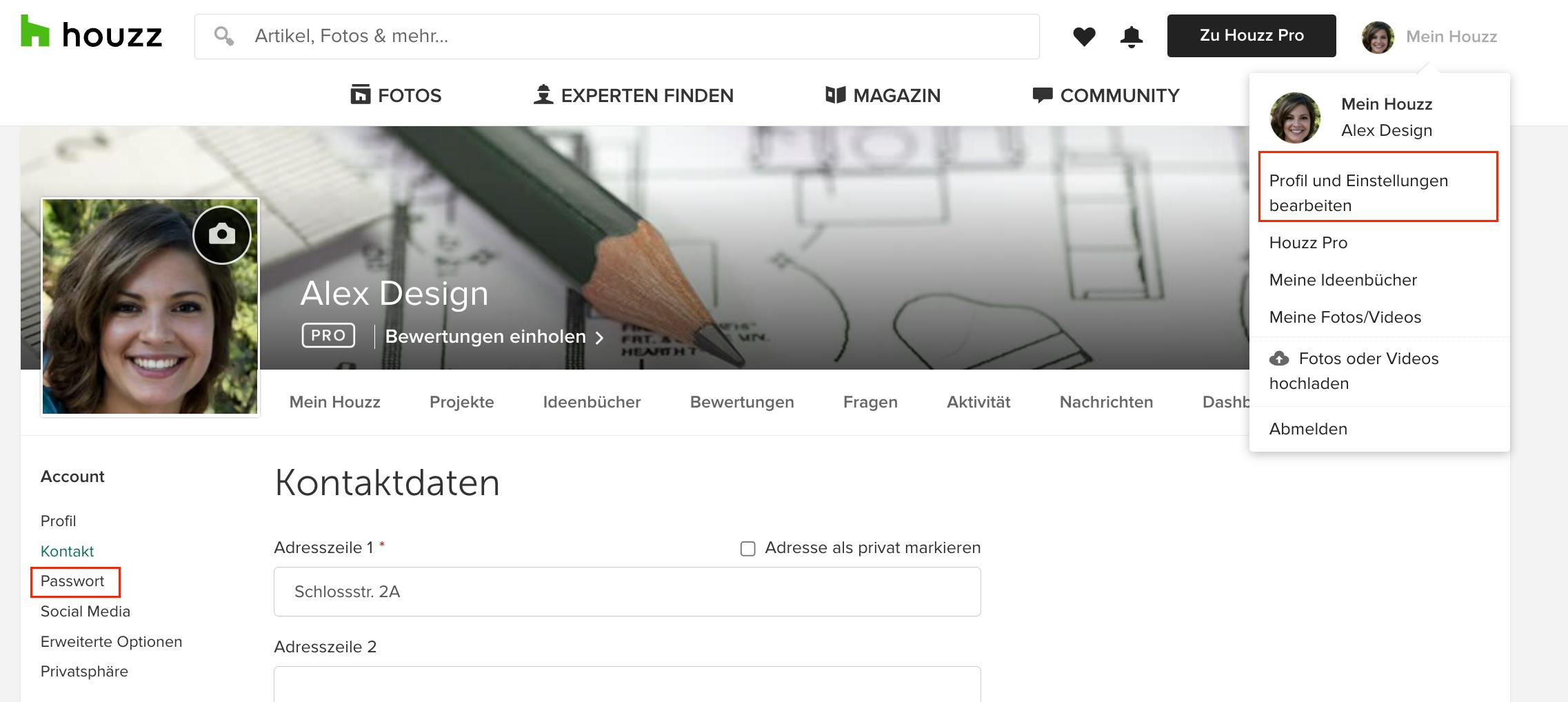 1. Hovern Sie auf Houzz.de über Ihr Profil-Icon und klicken Sie auf „Profil und Einstellungen bearbeiten“.