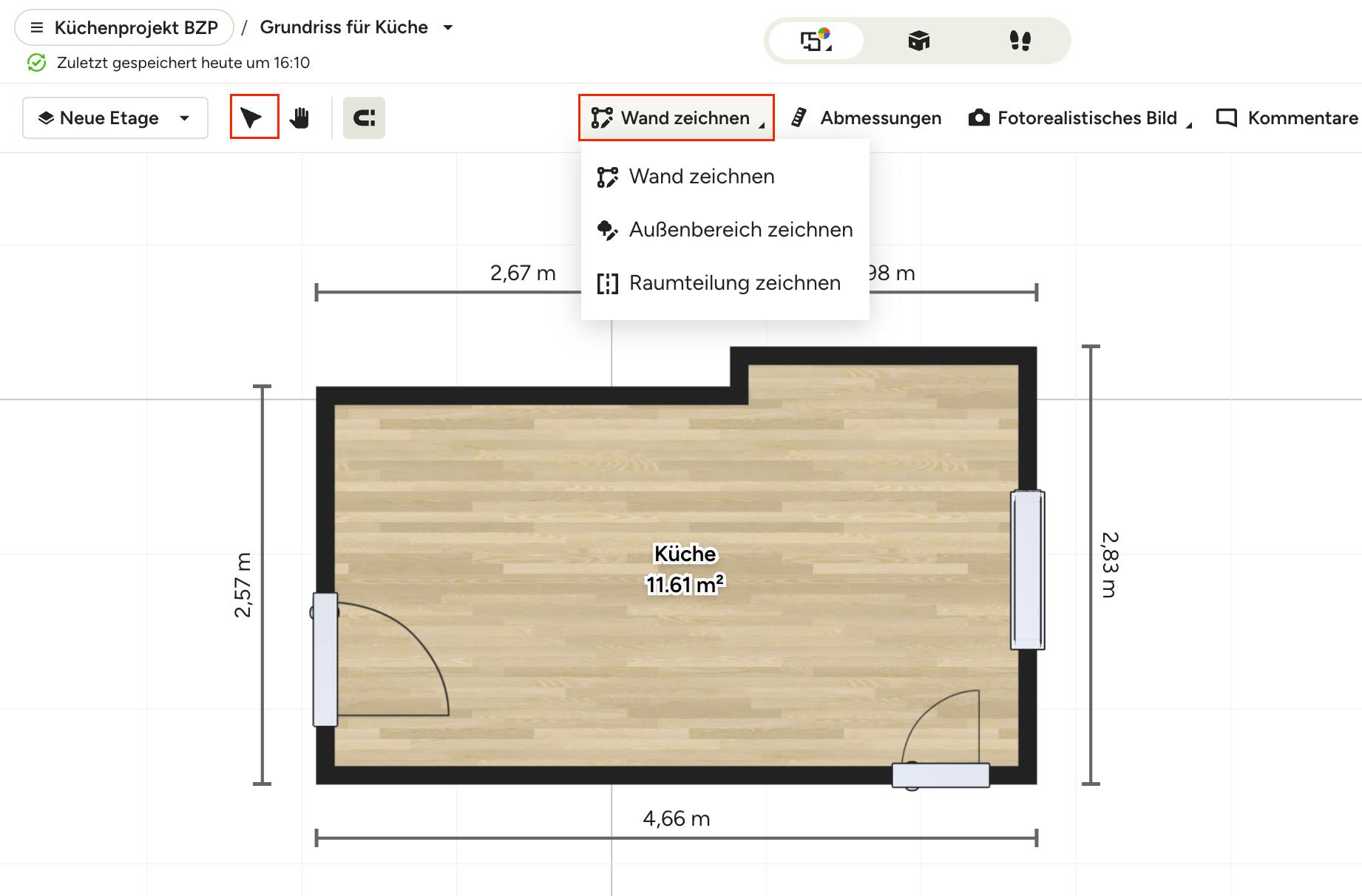 Um das Zeichnen von Wänden zu beenden und mit anderen Aktionen auf Ihrem 3D-Grundriss fortzufahren, klicken Sie auf den Zeiger in der oberen Menüleiste.