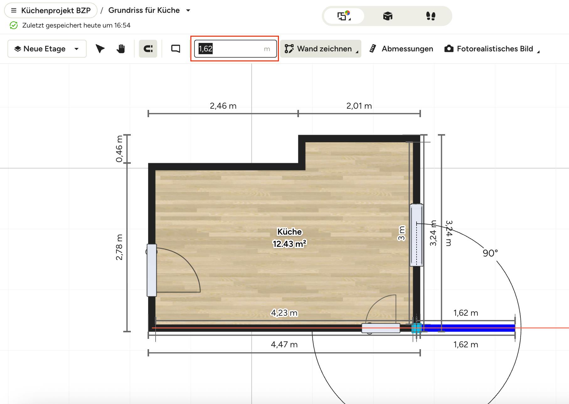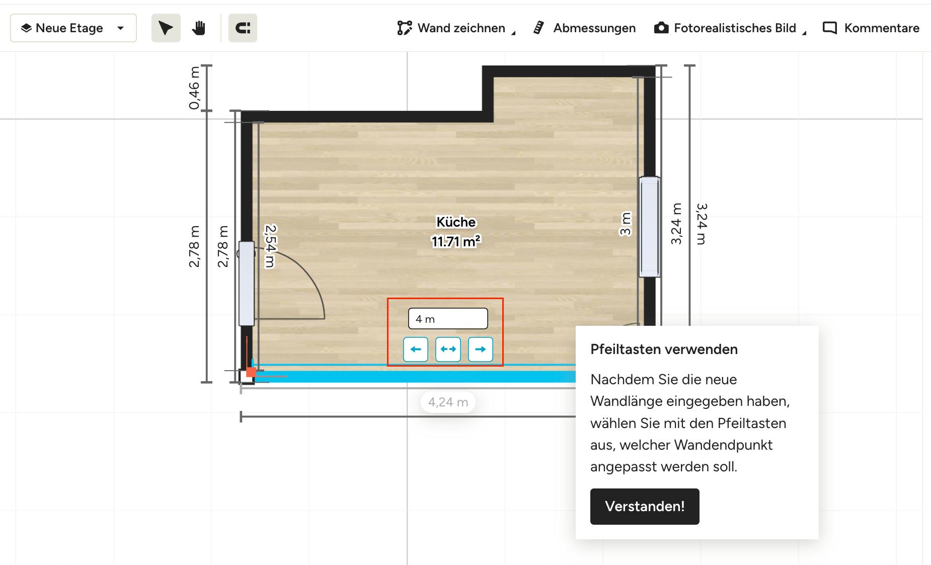 Wenn Sie eine neue Wand hinzufügen oder auf eine bestehende Wand in einem Grundriss klicken, gibt es verschiedene Wege, die genaue Wandlänge einzugeben.