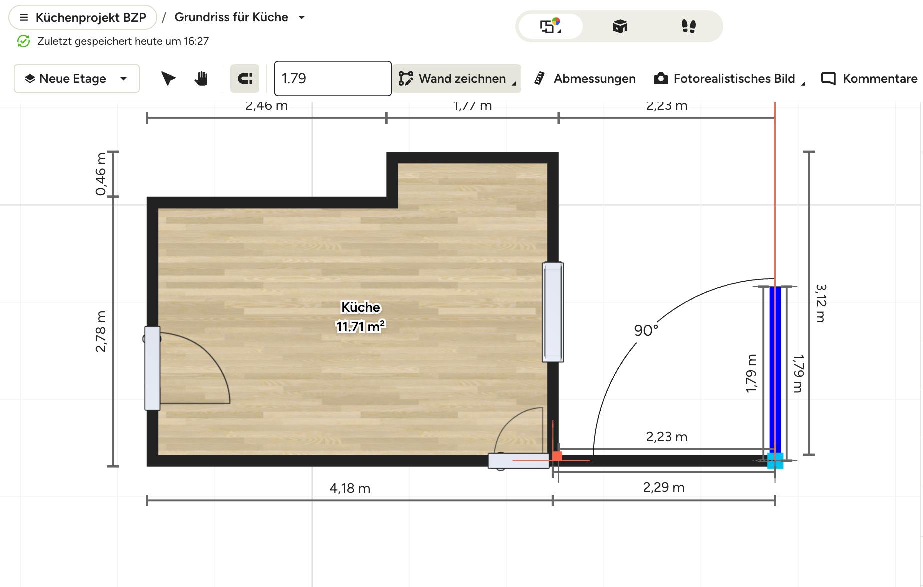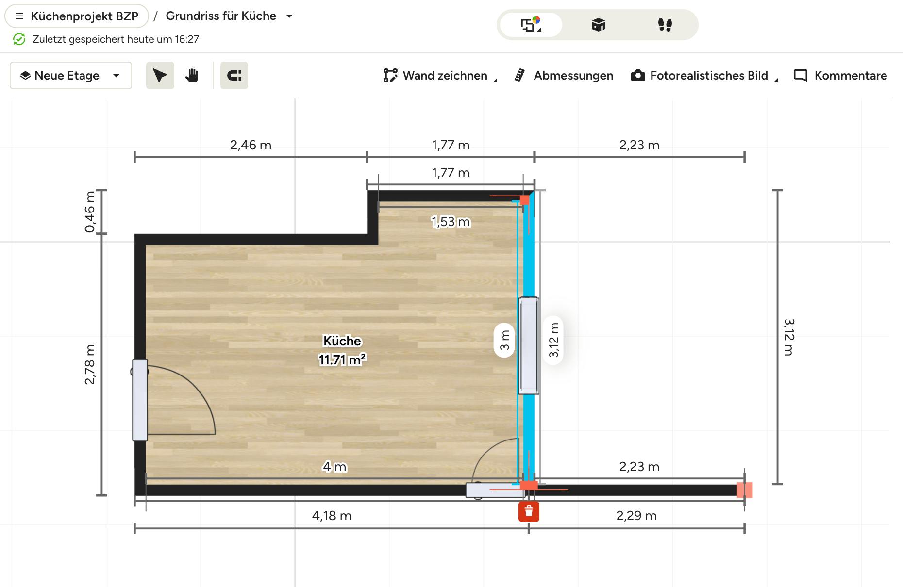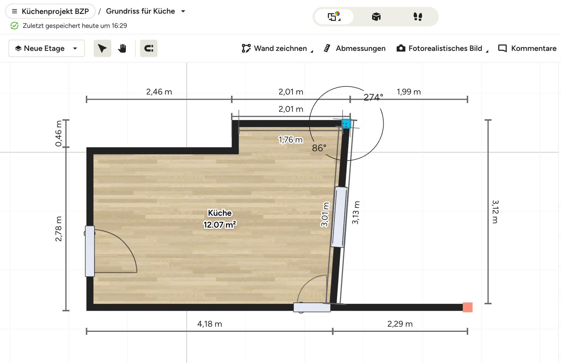 Sie können auch den Winkel der Wand ändern, ohne die Verbindung zu den angrenzenden Wänden zu trennen. Klicken Sie hierfür einfach auf eine Ecke und ziehen Sie sie zum gewünschten Platz.