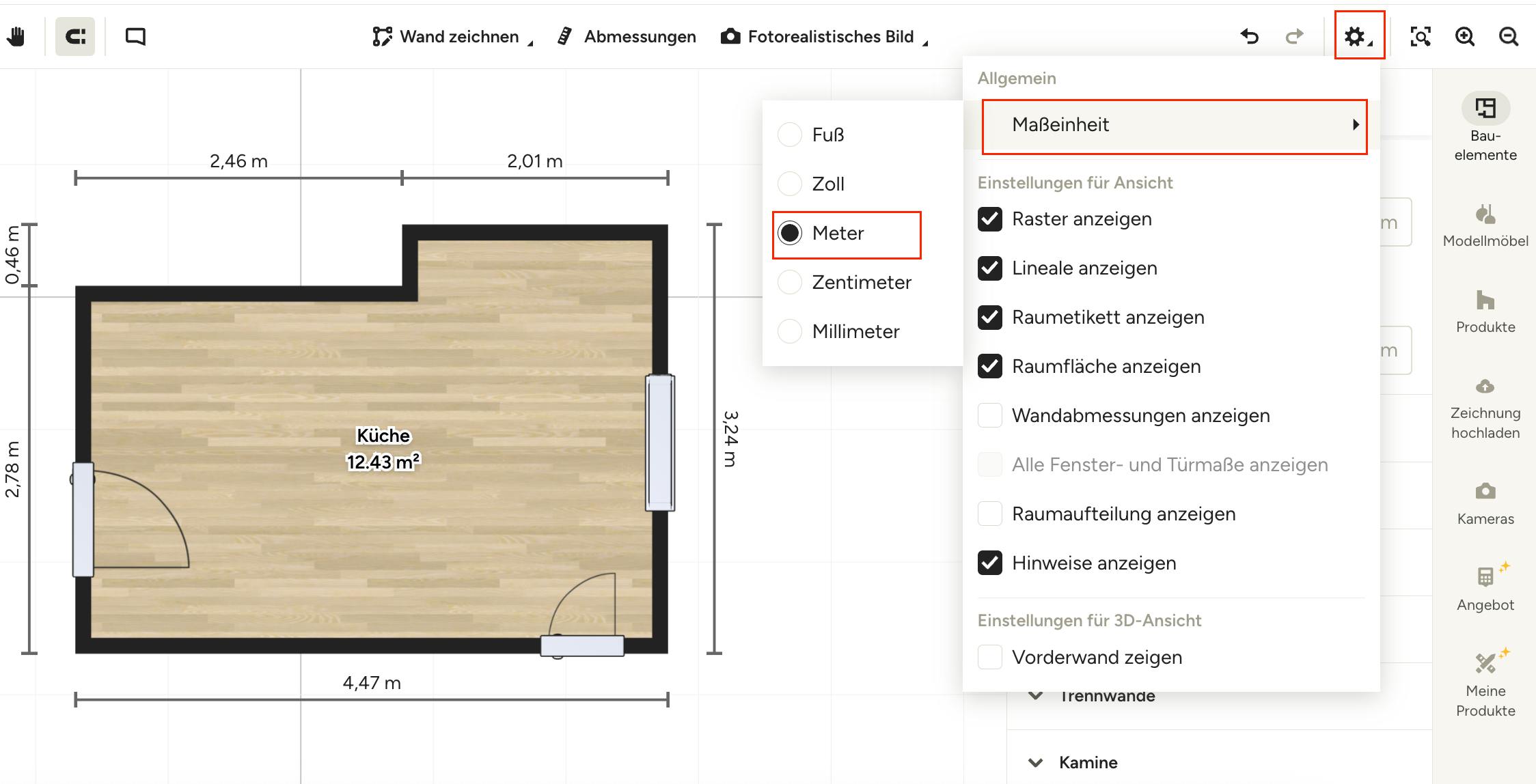 Wenn Sie die Maßeinheit im Grundriss ändern möchten, können Sie dies jederzeit in den Einstellungen tun.
