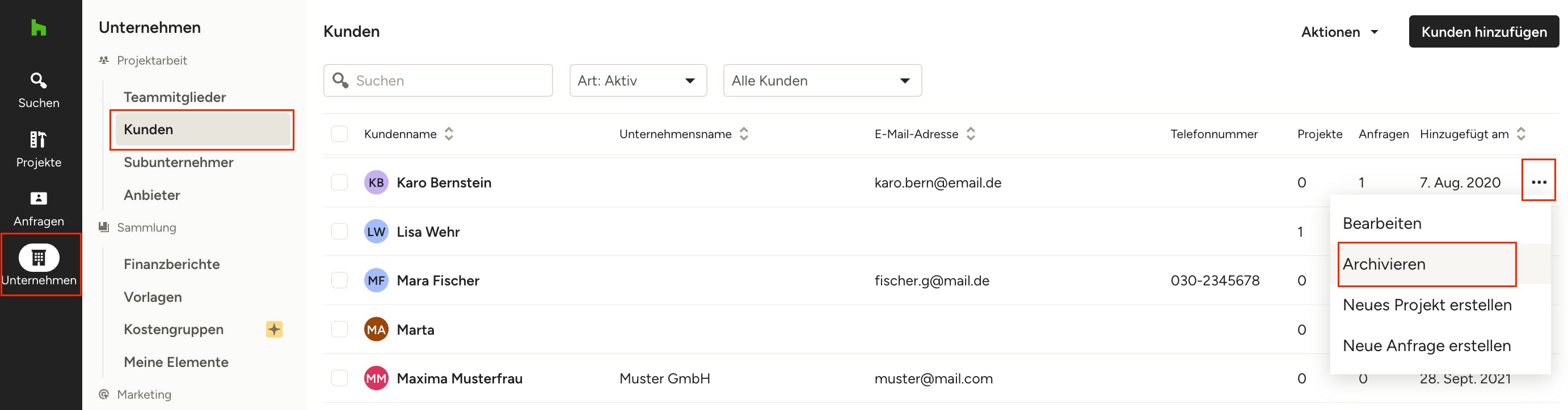 Sie sehen nun eine Liste aller Ihrer Kunden und Kundinnen. Um einen Kunden bzw. eine Kundin zu archivieren, fahren Sie mit dem Mauszeiger über den Eintrag und klicken Sie auf die drei Punkte rechts und wählen aus dem Dropdown-Menü die Option „Archivieren“.