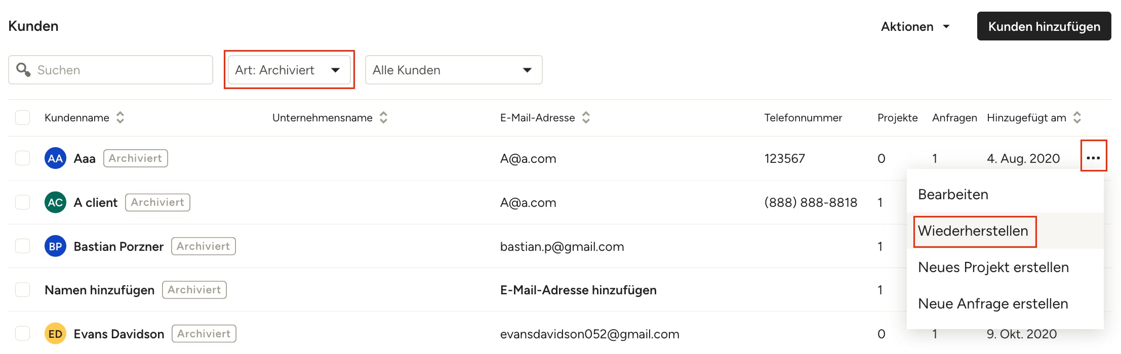 Wenn Sie einen Kunden/eine Kundin aus dieser Liste wiederherstellen möchten, bewegen Sie den Mauszeiger über den Eintrag und klicken Sie auf die drei Punkte rechts. Wählen Sie anschließend „Wiederherstellen“ aus dem Dropdown-Menü.