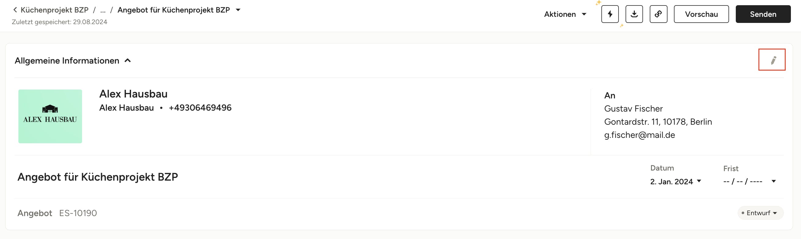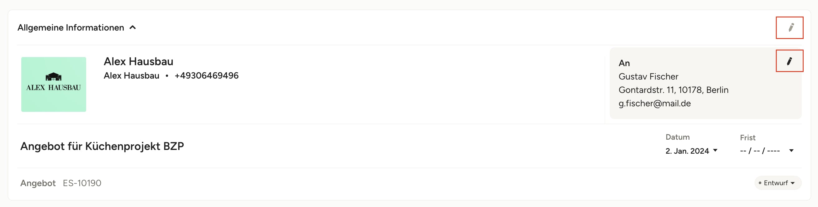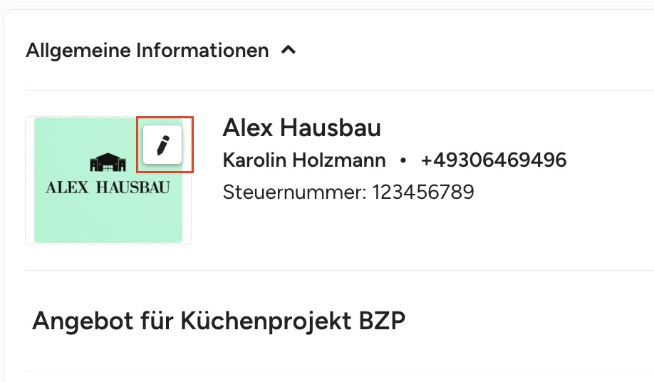 Sie können die Erstellungsdaten Ihres Angebots und Ihrer Rechnung anpassen, um Ihnen die volle Kontrolle über Ihre Buchhaltung und die Darstellung Ihrer Dokumente zu geben. Um das Erstellungsdatum eines Dokuments zu bearbeiten, klicken Sie zuerst auf das Stiftsymbol oben rechts im Abschnitt „Allgemeine Informationen“.