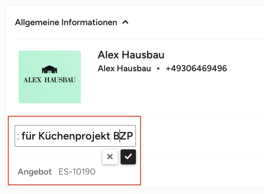 Sie können auch den Dokumenttitel, die Art und die Kennnr. auch bearbeiten, ohne die allgemeinen Info-Einstellungen zu öffnen. Klicken Sie einfach auf das Element, das Sie ändern möchten, geben Sie Ihre Anpassungen ein und klicken Sie dann auf das Häkchensymbol, um die Änderungen zu speichern.