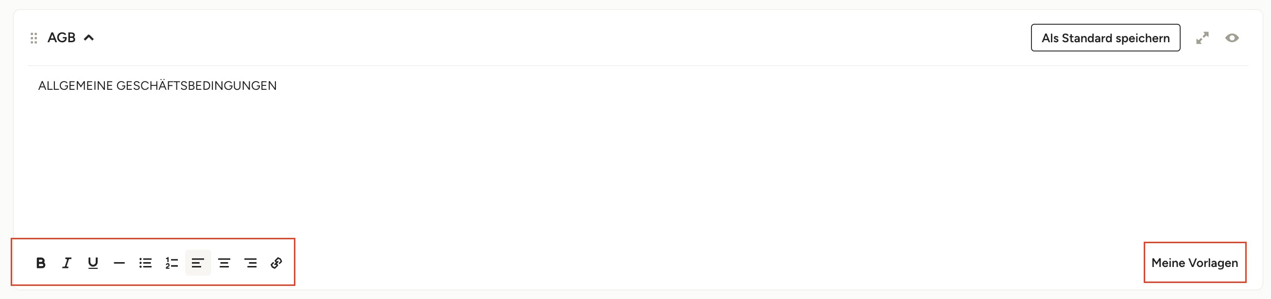 Um Vorlagen für AGB und Memos nach Dokumentenart anzuzeigen, zu bearbeiten und zu speichern, klicken Sie unten im jeweiligen Abschnitt auf „Meine Vorlagen“.