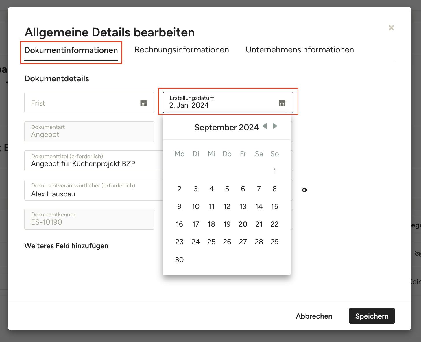 In dem sich öffnenden Fenster finden Sie das Feld „Erstellungsdatum“ unter dem Tab „Dokumentinformationen“ und klicken Sie darauf, um den Kalender aufzurufen, in dem Sie das gewünschte Datum auswählen können. Klicken Sie auf „Speichern“, um Ihre Änderungen zu übermitteln.