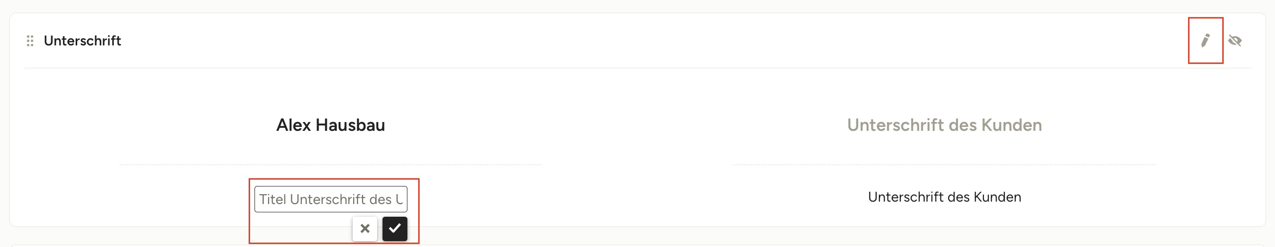 Kundensignaturen können auf Angeboten und Bestellungen eingeholt werden. Pro Dokument kann nur eine Empfängersignatur eingeholt werden. Sie können die Titel der Firmen- und Kunden-/Anbieter-/Subunternehmersignatur direkt im Dokument bearbeiten, indem Sie darauf klicken, Änderungen vornehmen und auf das Häkchen klicken, um die Änderungen zu speichern.