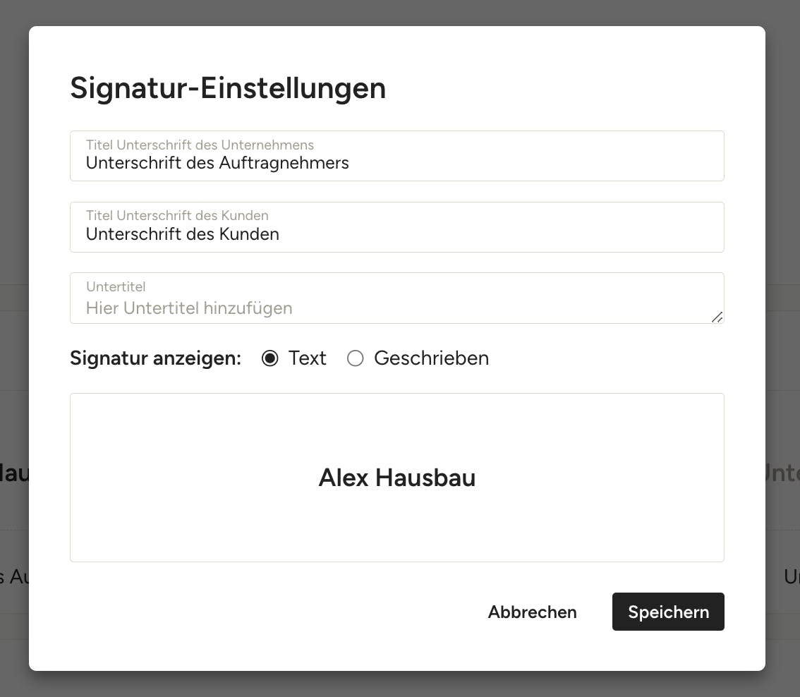 Innerhalb der Signatur-Einstellungen können Sie wählen, ob Ihre Firmenunterschrift als Text oder handschriftlich mit der Maus signiert angezeigt werden soll. Klicken Sie auf „Speichern“, um alle Änderungen zu übernehmen.