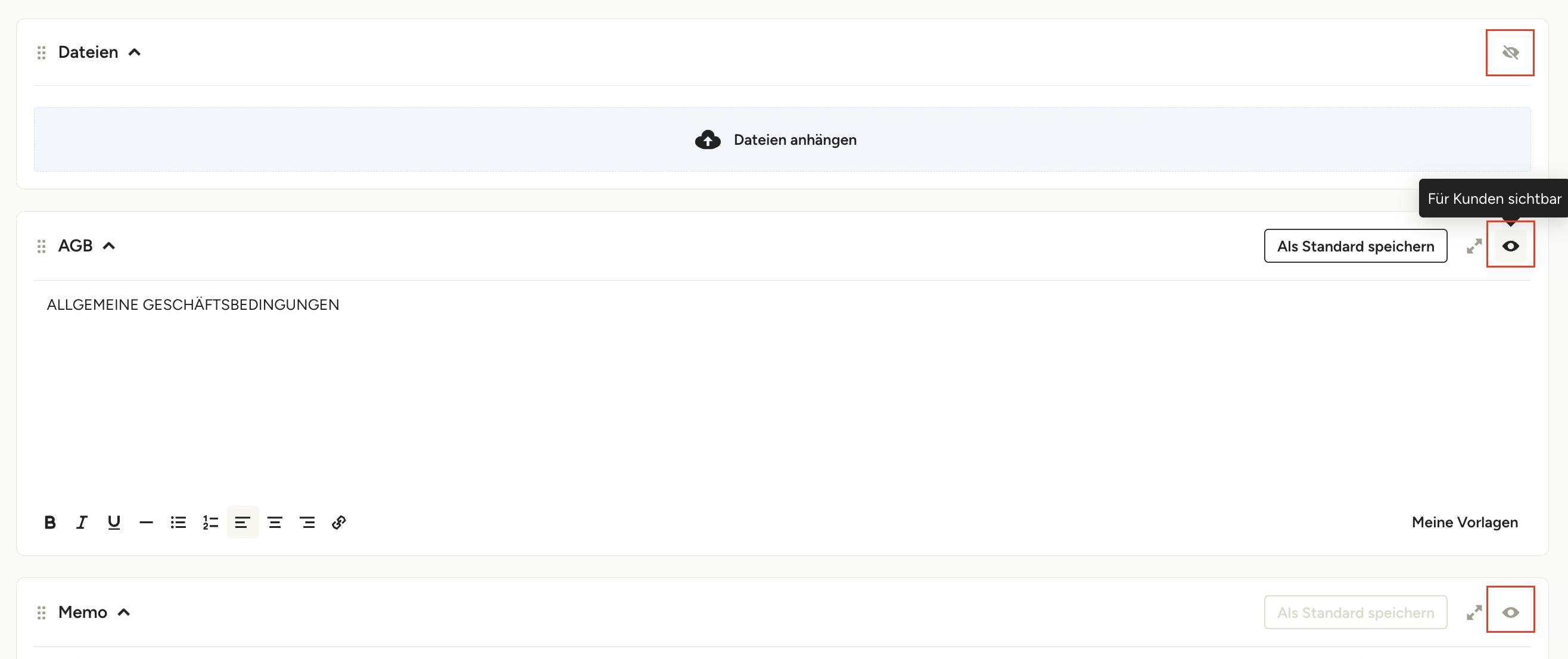 Sie haben die volle Kontrolle darüber, was Ihre Kund*innen in jedem Dokument sehen können oder nicht, indem Sie die Sichtbarkeitseinstellungen pro Abschnitt ändern. Sie können Dateien, AGB, Memos und Unterschriften anzeigen oder ausblenden, indem Sie auf das Augensymbol in der oberen rechten Ecke des jeweiligen Abschnitts klicken. Fahren Sie mit der Maus über das Auge, um die aktuelle Einstellung zu sehen. Sie können auch oben im Dokument auf „Vorschau“ klicken, um genau zu sehen, was Ihre Kund*innen sehen werden.