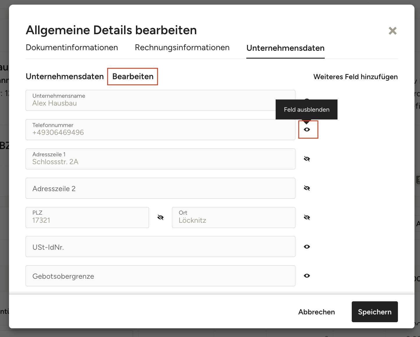 Um bestimmte Aspekte Ihrer Unternehmensdaten auszublenden, klicken Sie auf das Augensymbol neben den Informationen, die Sie ausblenden möchten.