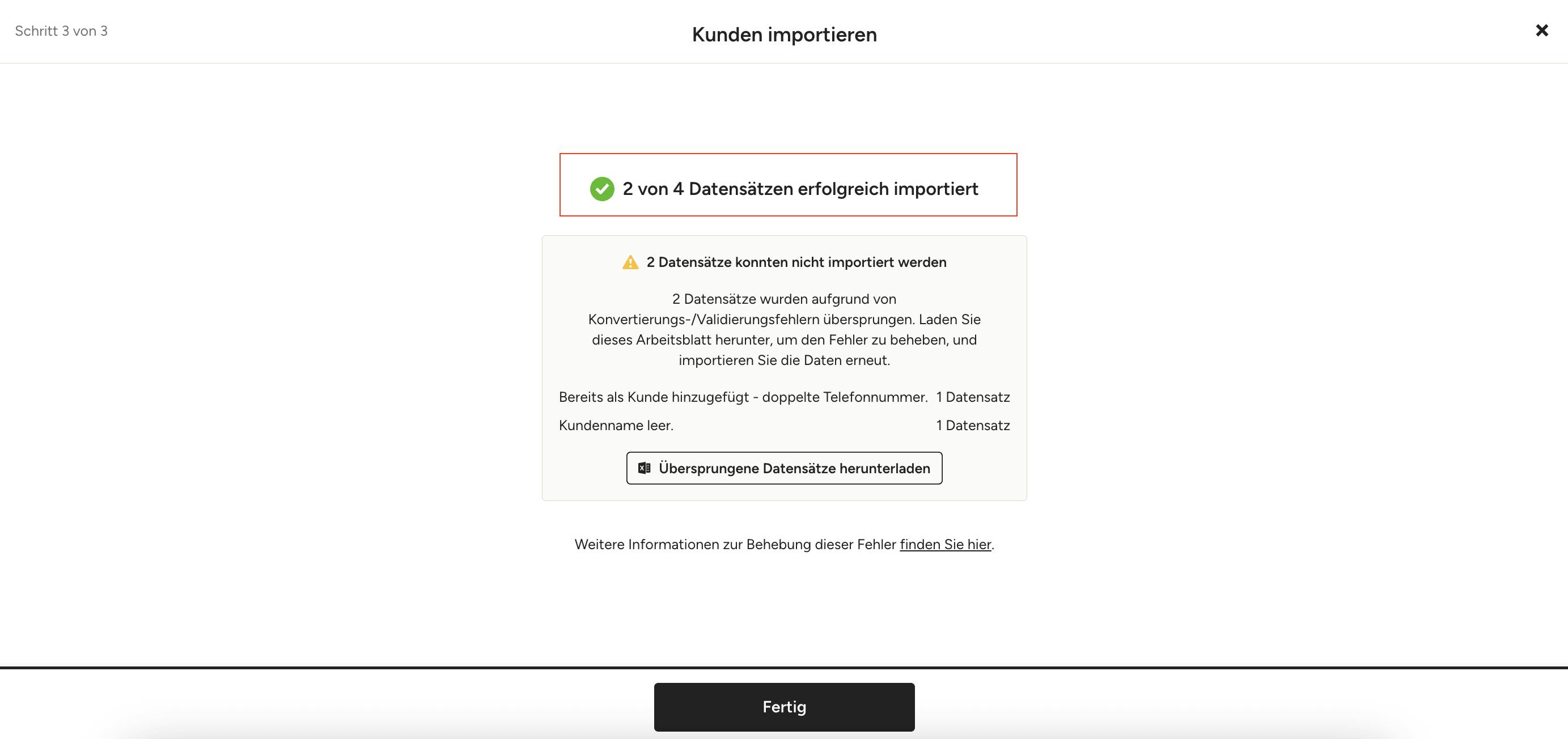 8. Wenn Ihre Datei erfolgreich importiert wurde, erhalten Sie eine Bestätigung, wie viele Datensätze erfolgreich importiert wurden. Klicken Sie auf „Fertig“, um zu Ihrer Kundenseite zurückzukehren.