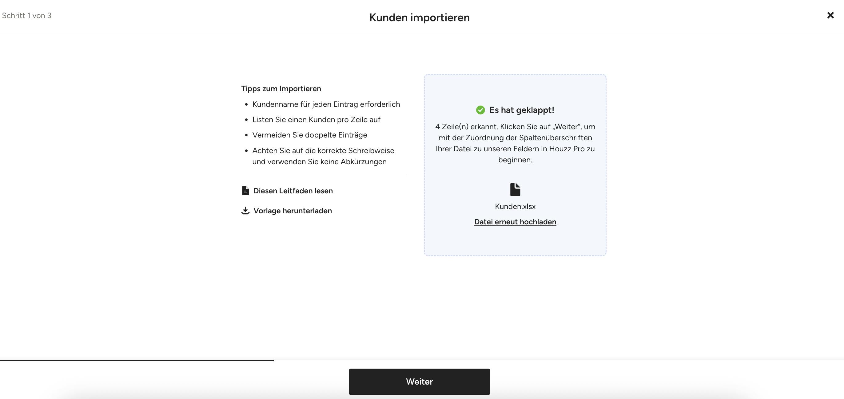 6. Im Import-Fenster klicken Sie auf „durchsuchen“ und hängen Sie die Datei an oder legen Sie sie per Drag-and-Drop in der blauen Import-Box ab. Wenn es geklappt hat, wird eine Meldung angezeigt, die angibt, wie viele Zeilen das System in Ihrer Datei gefunden hat. Klicken Sie auf „Weiter“, um mit der Zuordnung der Spalten Ihrer Datei zu den Feldern von Houzz Pro zu beginnen.