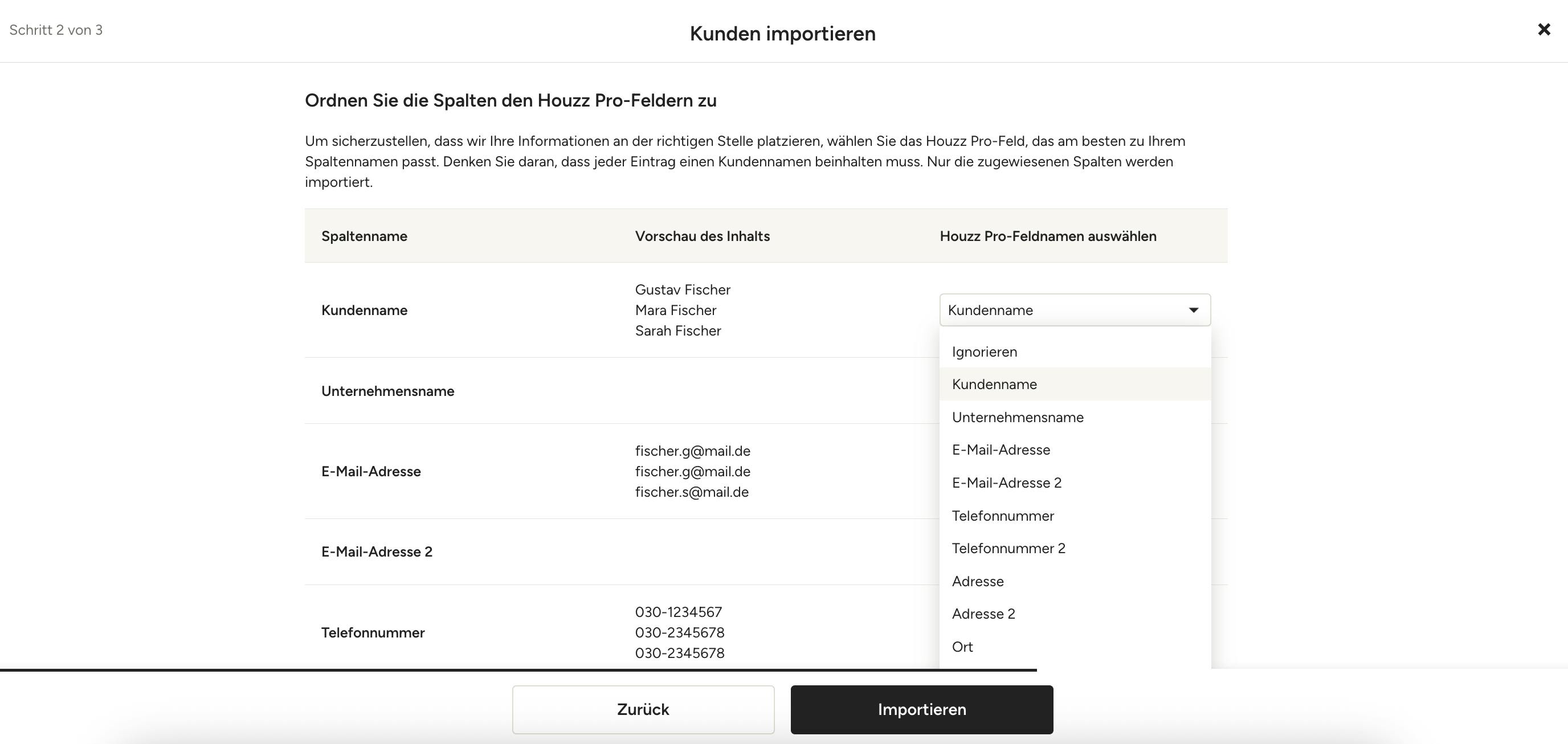 7. Wählen Sie das Feld, das dem Namen Ihrer Spalte am besten entspricht. Nur die Spalten, die Sie zuordnen, werden importiert. Klicken Sie auf „Importieren“, wenn Sie mit dem Zuordnen fertig sind.