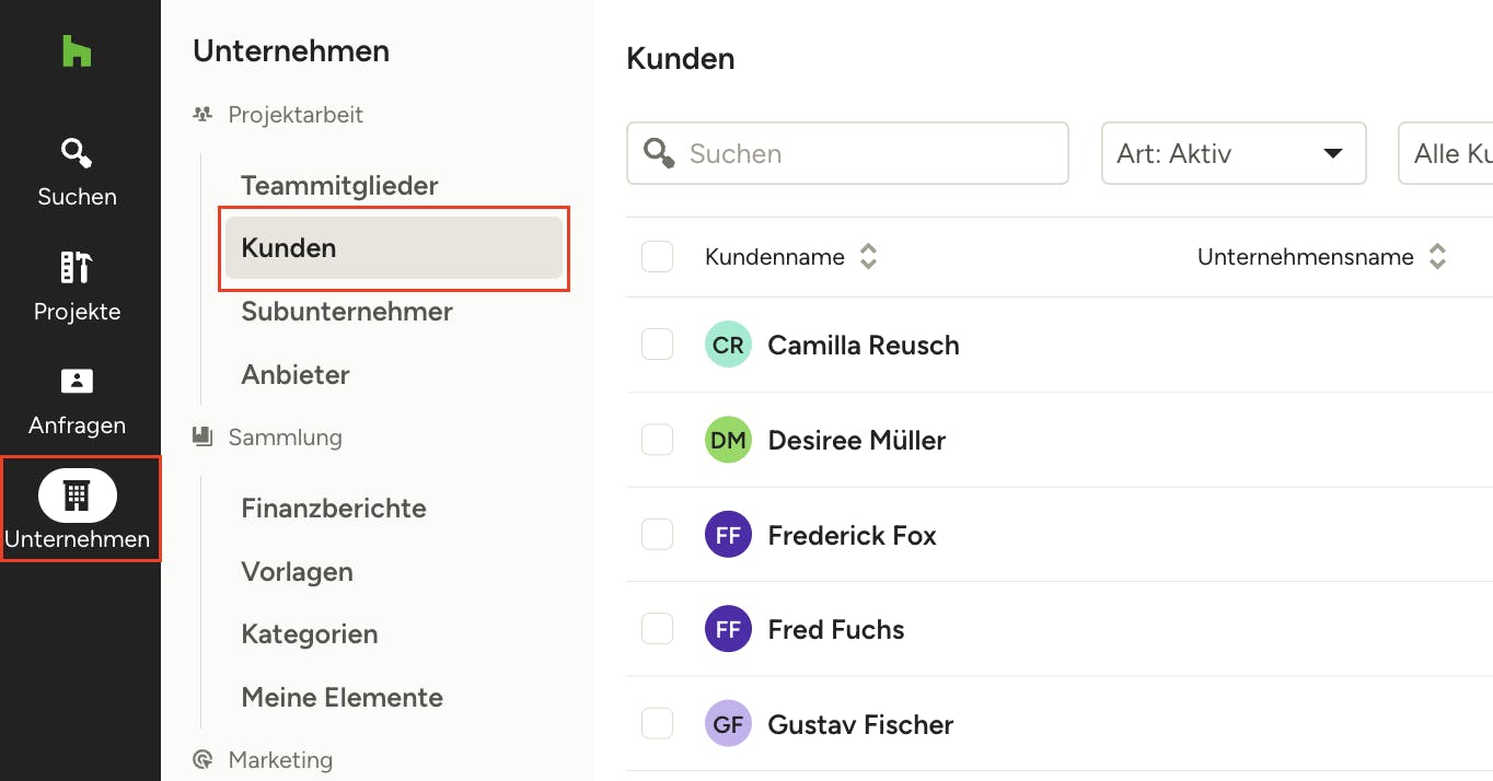 1. Im Menüpunkt „Unternehmen“ wählen Sie „Kunden“.