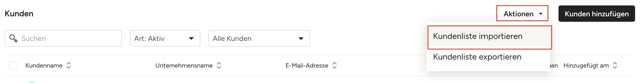 2. Im Menü „Aktionen“ oben rechts wählen Sie „Kundenliste importieren“.