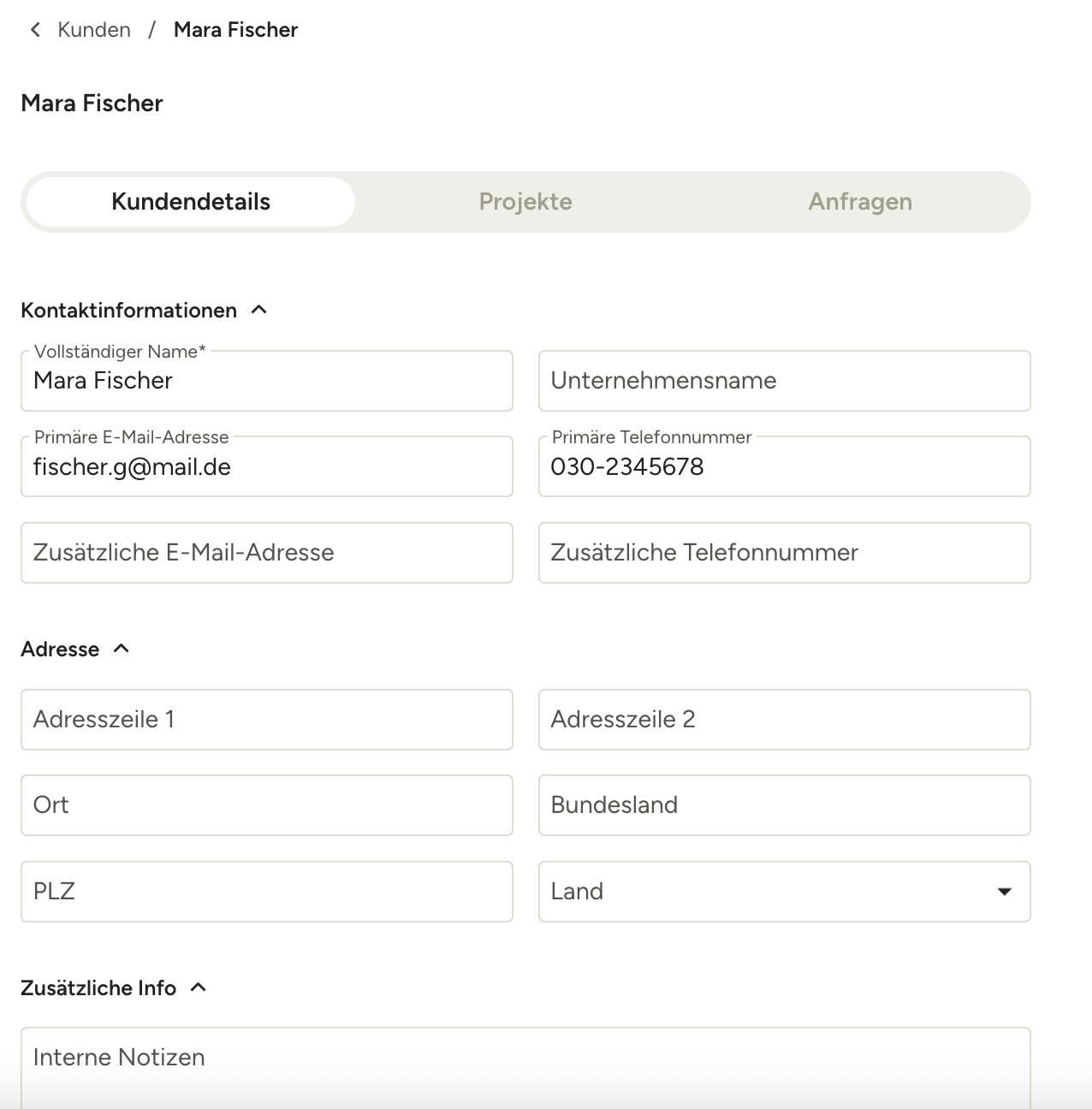 In der Kundenliste können Sie die wichtigsten Details zu jedem Kontakt sehen. Um die Details eines Kunden/einer Kundin zu bearbeiten oder die Projekte und/oder Anfragen einzusehen, klicken Sie auf den Namen oder verwenden Sie die drei Punkte ganz rechts neben den Kundendetails, um weitere Optionen aufzurufen.