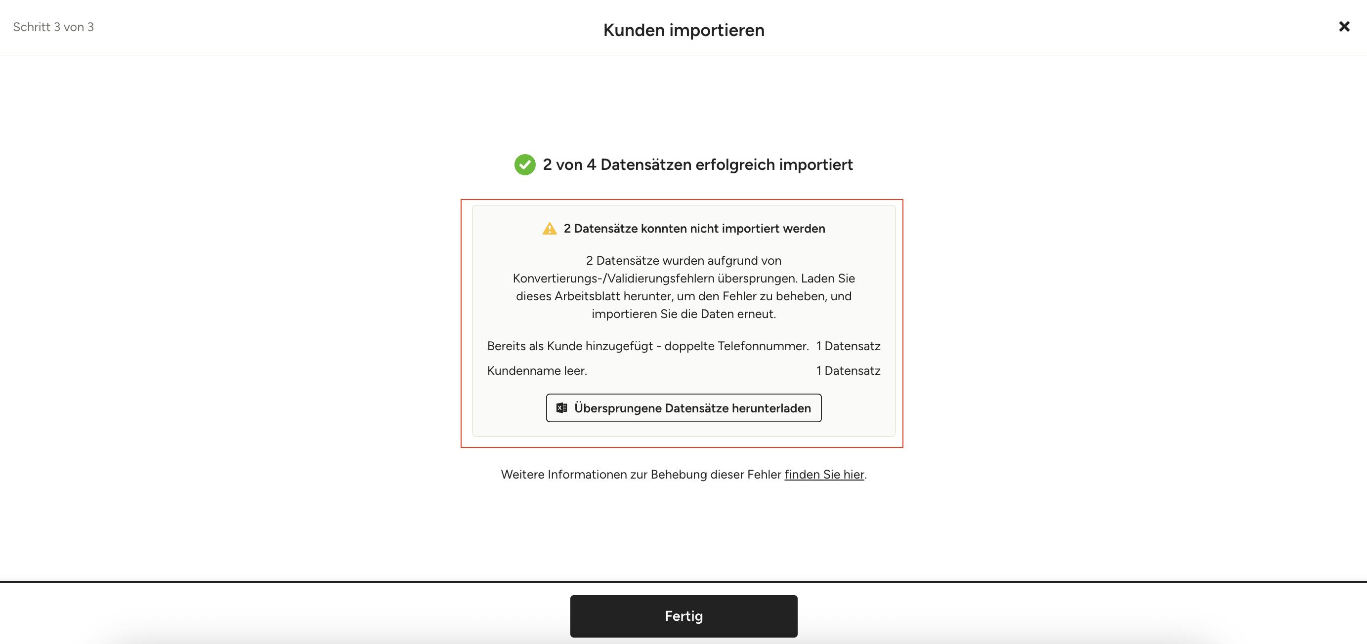 Wenn das Hochladen einiger Einträge in Ihrer Datei fehlschlägt, werden die verbleibenden Einträge, die erfolgreich sind, dennoch erfolgreich in Ihre Kundenliste hochgeladen. Wenn in Schritt 3 von 3 Fehler auftreten, sehen Sie, wie viele Einträge/Datensätze fehlgeschlagen sind und um welche Fehler es sich handelt. Sie haben dann die Möglichkeit, die übersprungenen Einträge herunterzuladen, sie zu korrigieren und erneut hochzuladen.