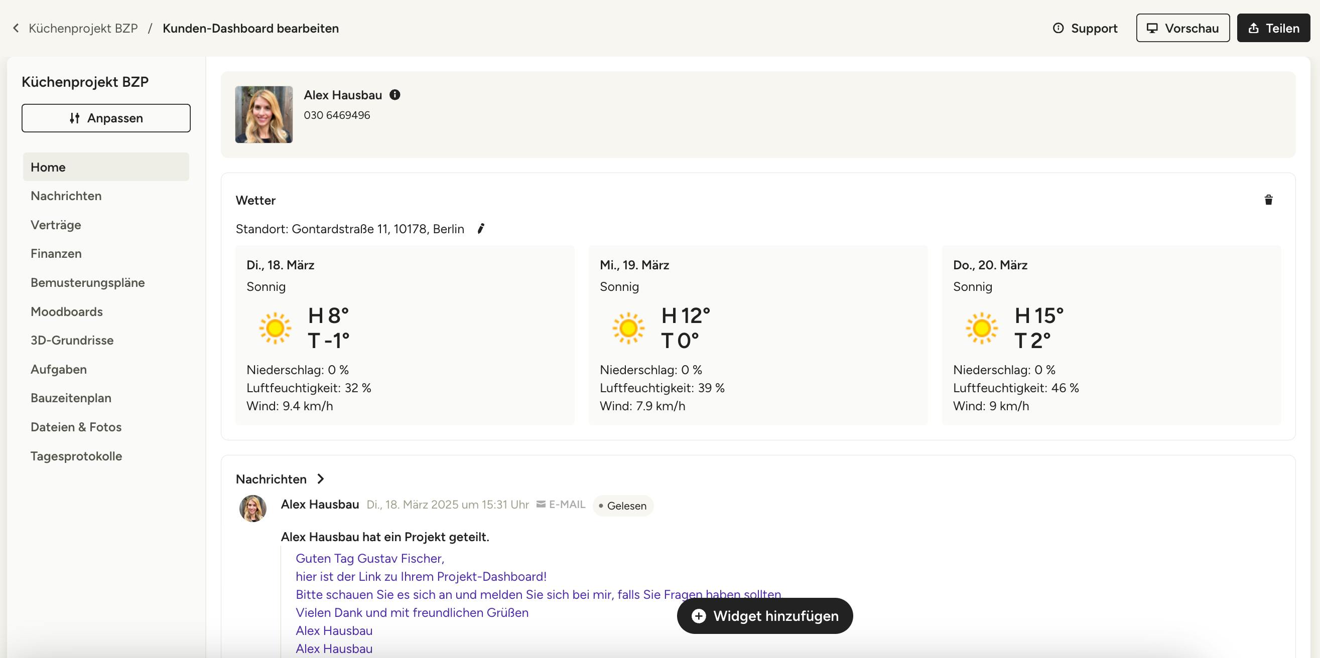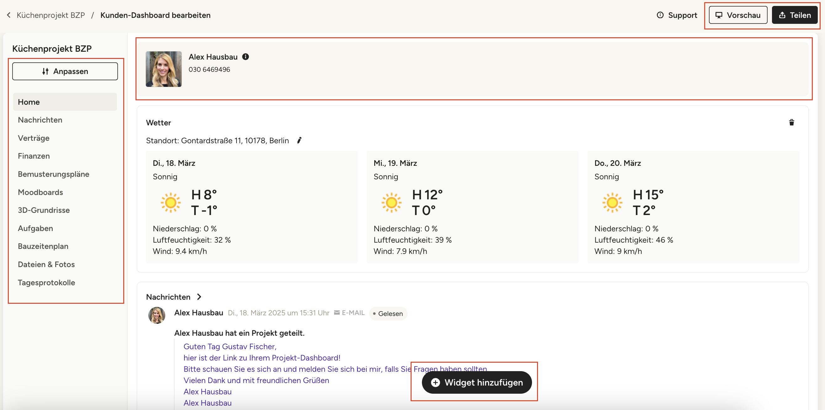 Standardmäßig erlaubt Ihr Kunden-Dashboard nur den Zugriff auf Nachrichten – Sie müssen den Zugriff auf jede einzelne Funktion, die Ihr Kunde/Ihre Kundin sehen soll, freigeben. Dazu gehört der Zugriff auf Finanzen, Bemusterungspläne, Moodboards, 3D-Grundrisse, Aufgaben, Bauzeitenplan, Dateien & Fotos sowie Tagesprotokolle.