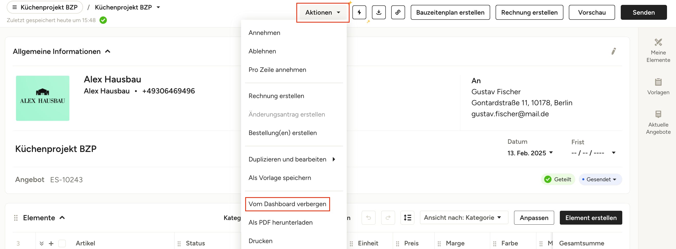 Wenn Sie ein Angebot, eine Rechnung oder einen Änderungsantrag an Ihren Kunden/Ihre Kundin senden, erscheint dieses Dokument automatisch im Kunden-Dashboard.