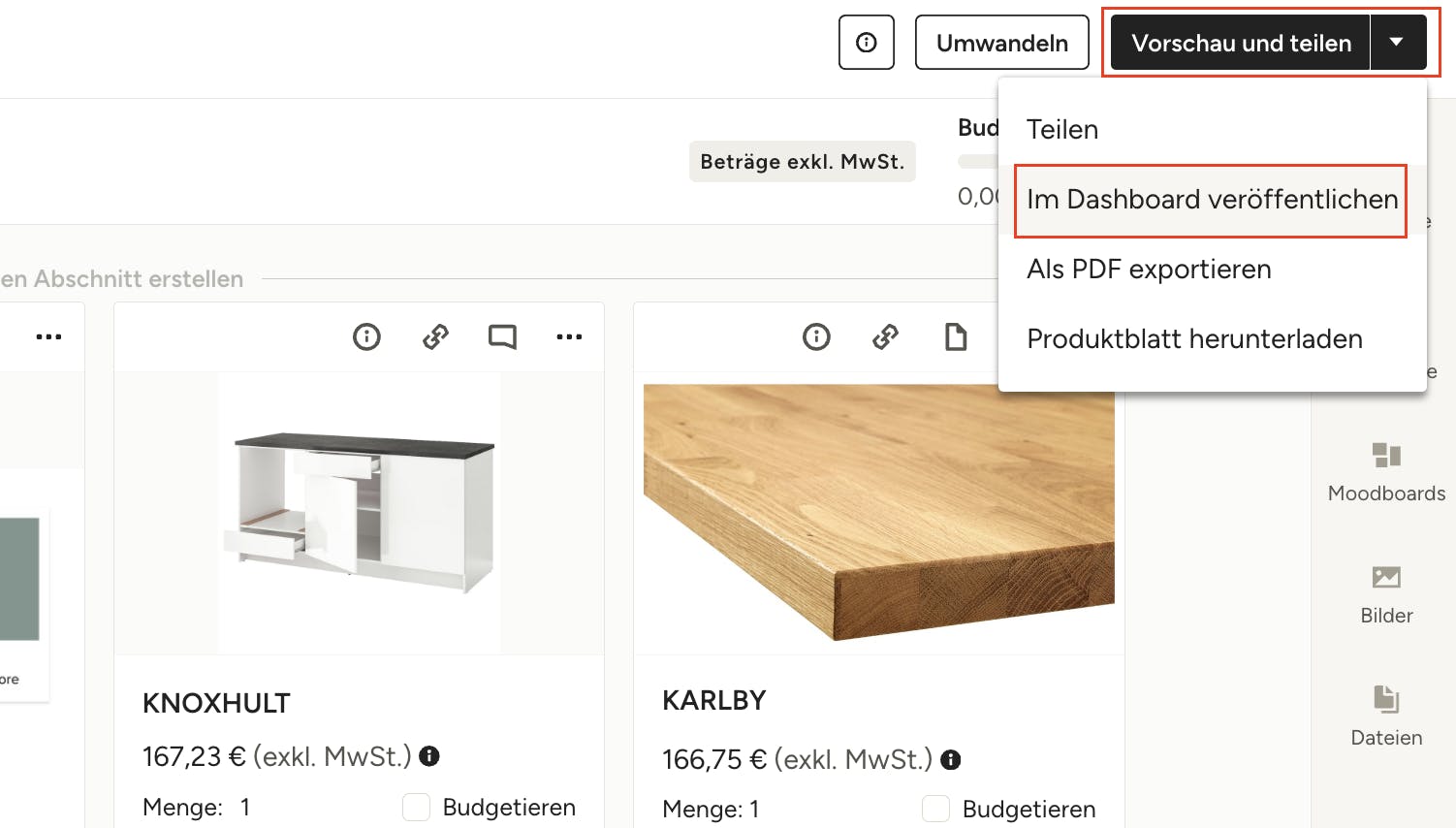 Die Freigabe für Bemusterungspläne, Moodboards und 3D-Grundrisse läuft gleich ab. Öffnen Sie das relevante Projekt und wählen Sie „Bemusterungspläne“, „Moodboards“ oder „3D-Grundrisse“ im linken Menü. Öffnen Sie das Objekt, das Sie teilen möchten, klicken Sie auf „Vorschau und teilen“ (oder nur „Teilen“) und wählen Sie „Im Dashboard veröffentlichen“.