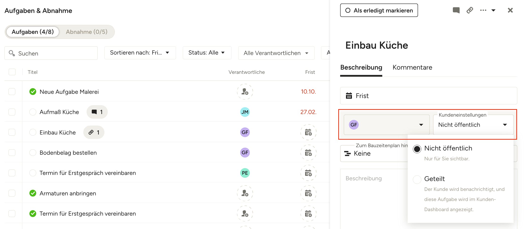Wählen Sie unter „Kundeneinstellungen“ die Option „Geteilt“, um die Aufgabe zum Kunden-Dashboard hinzuzufügen. Wählen Sie „Nicht öffentlich“, wenn Sie die Aufgabe nicht in das Kunden-Dashboard aufnehmen möchten.
