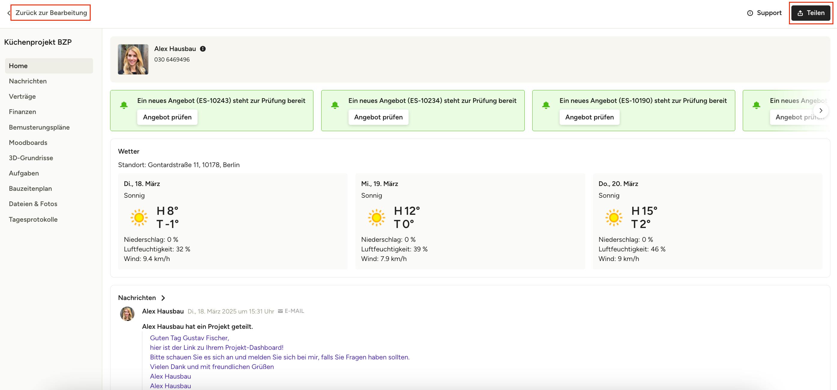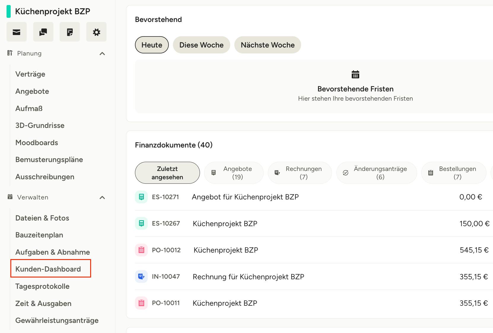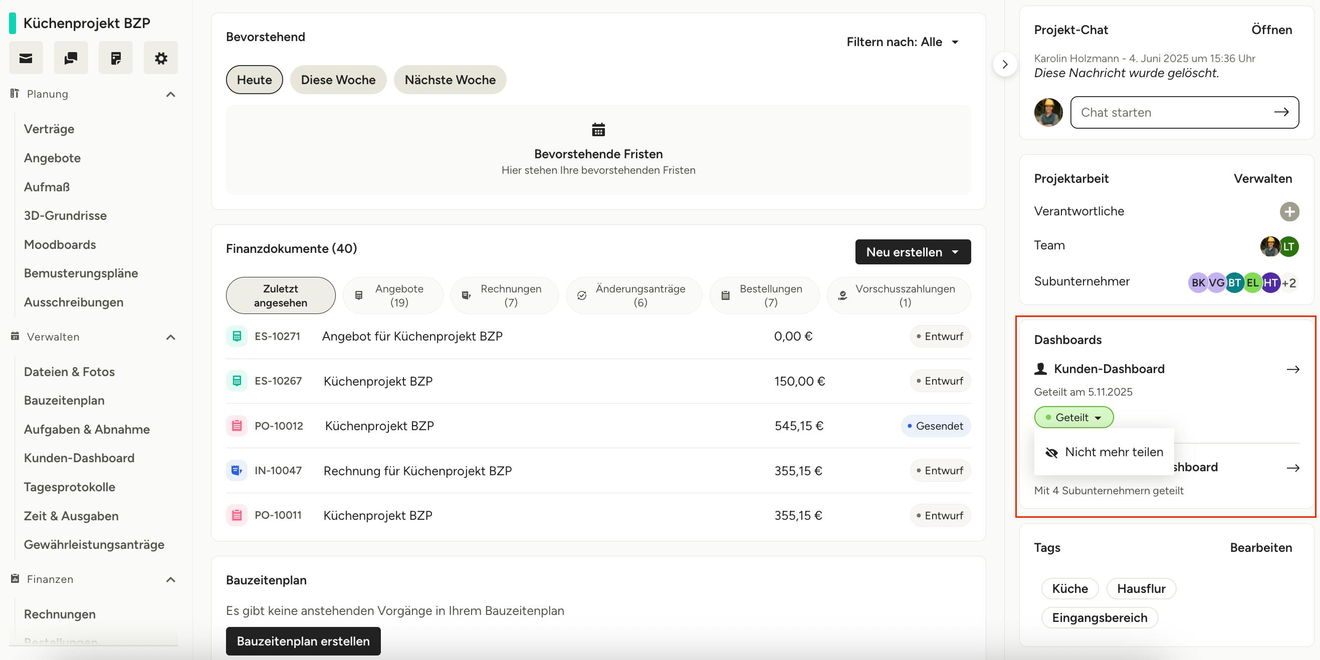Wenn Sie das Kunden-Dashboard teilen, können Ihre Kund*innen alles an einem Ort einsehen, einschließlich Finanzdokumente, Bauzeitenplan, Dateien & Fotos, Nachrichten, 3D-Grundrisse und mehr. Sie haben die komplette Übersicht zu ihrem Projekt und fühlen sich so mehr ins Projekt involviert und unterstützt.