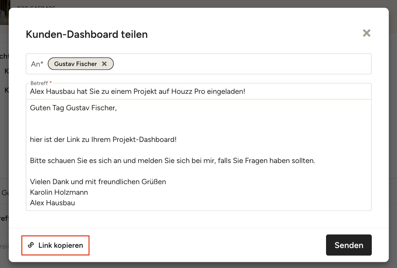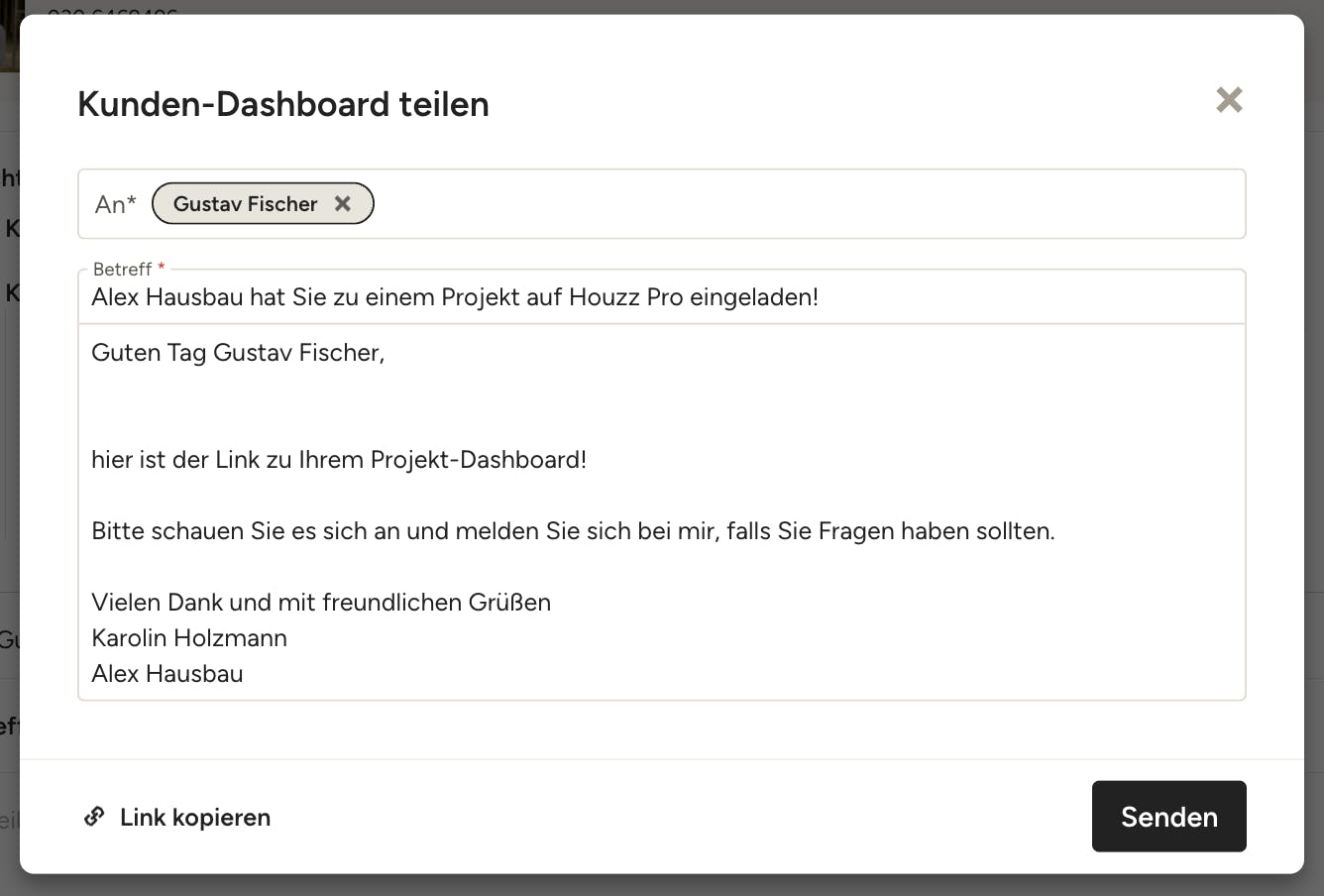 Sie können das Kunden-Dashboard ganz einfach direkt aus Houzz Pro teilen. Im Freigabefenster ist die E-Mail-Adresse Ihres Kunden/Ihrer Kundin bereits eingetragen – Sie können auch weitere E-Mail-Adressen in dieses Feld eingeben, wenn Sie das Dashboard mit mehreren Kund*innen oder anderen Personen teilen möchten. Ebenso sind die Standard-Betreffzeile und eine Standard-Nachricht voreingetragen. Sie können diesen Text beibehalten oder Ihren eigenen Text verfassen und anpassen. Wenn alles gut aussieht, klicken Sie auf „Senden“.