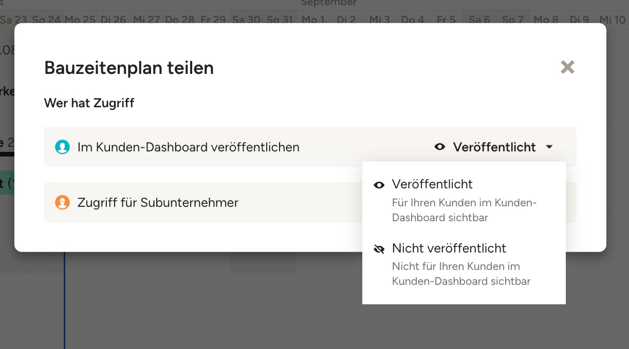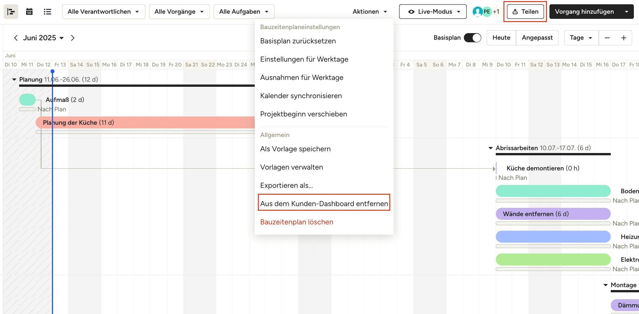 Klicken Sie oben rechts im Bild auf „Teilen“. Bitte beachten Sie: Im Bauzeitenplan können Sie den Kundenzugriff ganz einfach auch über das Aktionen-Menü einstellen.