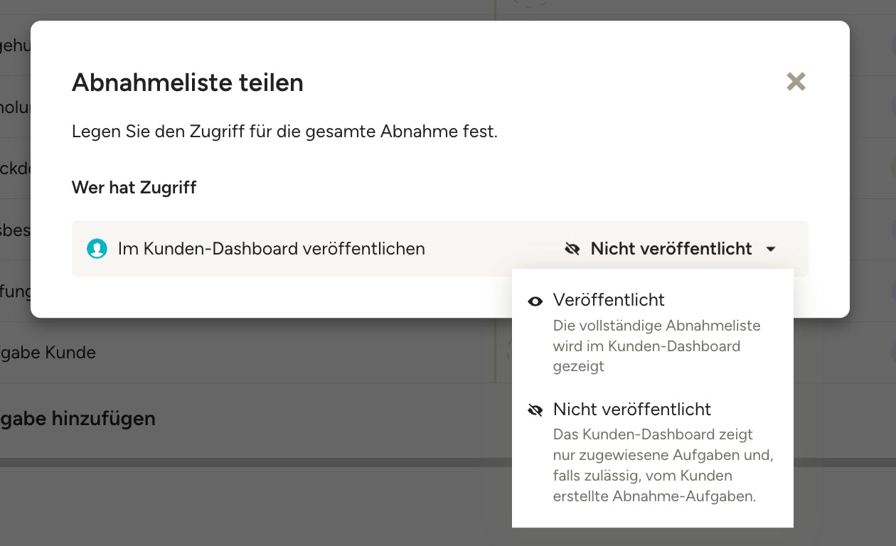 Auf der Seite „Aufgaben und Abnahme“ wählen Sie den Reiter „Abnahme“ oben und klicken Sie „Teilen“.