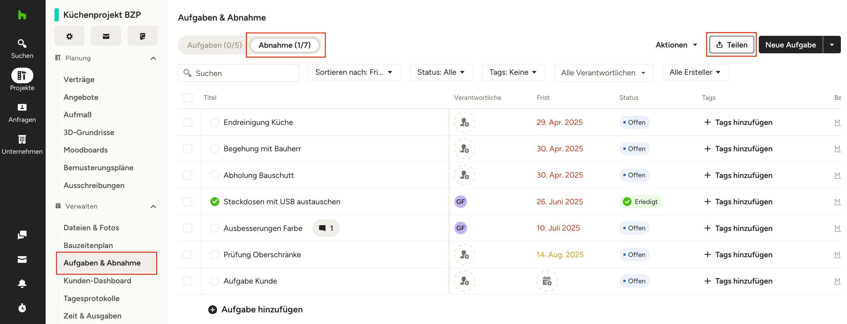 Um eine Abnahmeliste hinzuzufügen, öffnen Sie das gewünschte Projekt und wählen Sie „Aufgaben und Abnahme“ im Menü links.