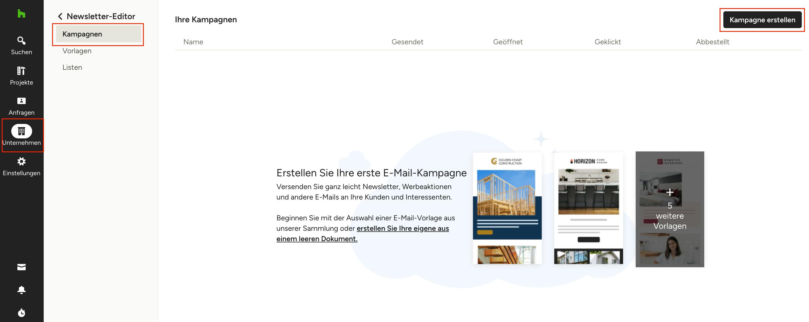 Um eine neue E-Mail-Kampagne zu erstellen, rufen Sie den Newsletter-Editor von Houzz Pro über das Unternehmenssymbol in der linken Navigation auf. Klicken Sie oben rechts auf „Kampagne erstellen“ und wählen Sie eine der voreingestellten Vorlagen je nach Art der Kampagne, die Sie versenden möchten, aus. Sie können auch Ihre eigenen Vorlagen von Grund auf neu erstellen, indem Sie auf Vorlagen > Meine Vorlagen > Vorlage erstellen gehen.