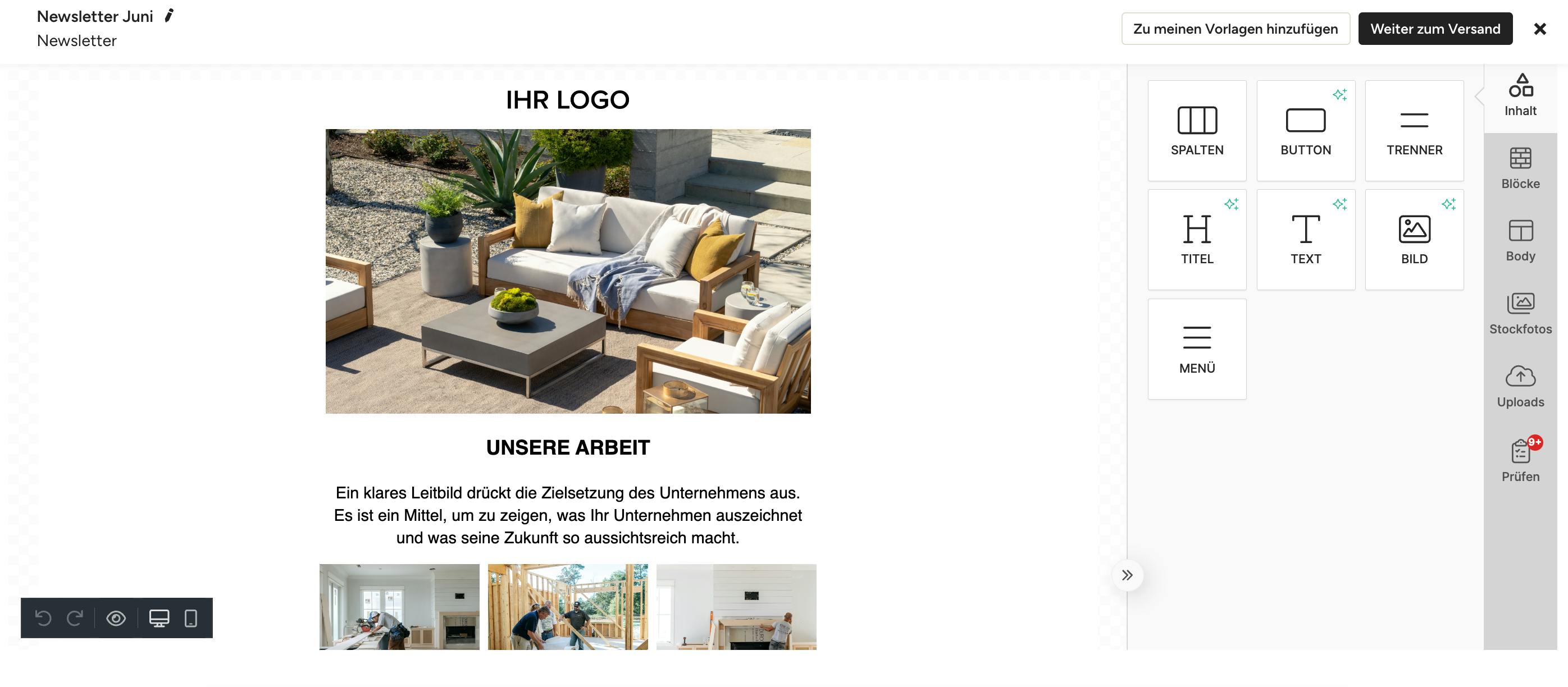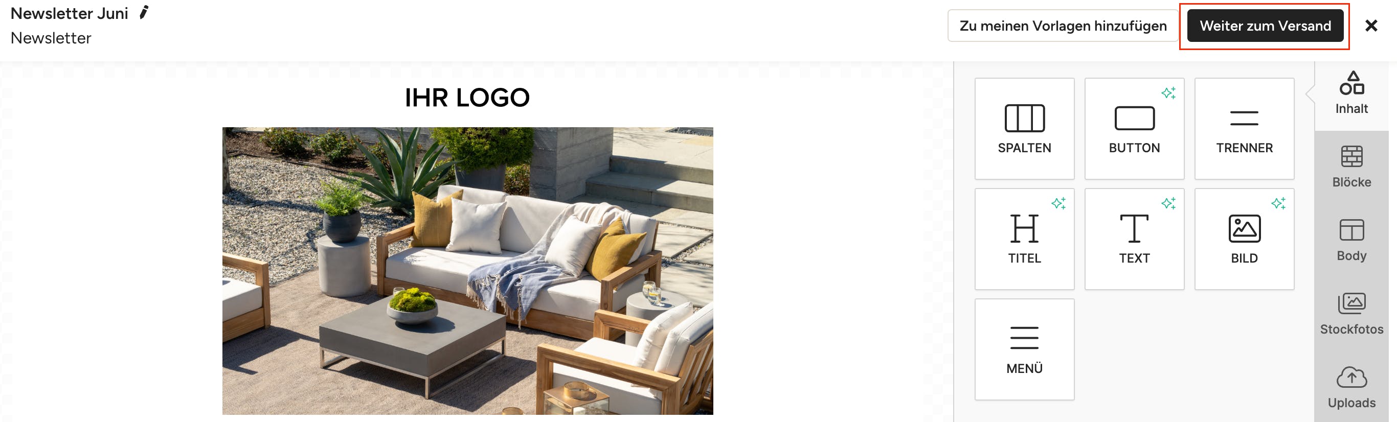 Wenn Sie mit dem Aussehen und dem Inhalt der E-Mail zufrieden sind, klicken Sie oben rechts auf der Seite auf „Weiter zum Versand“. Sie können vor dem Versand jederzeit zur Bearbeitung zurückkehren.