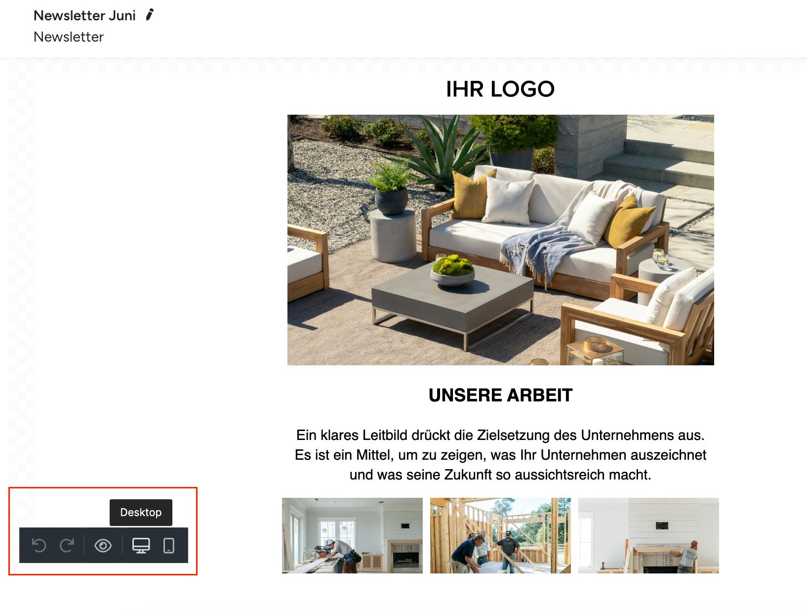 Sie können während der Bearbeitung ganz einfach zwischen der Standard-Desktop- und der mobilen Ansicht wechseln, um zu sehen, wie Ihre E-Mail-Kampagne auf verschiedenen Geräten aussieht. Klicken Sie einfach auf die Desktop- oder Handy-Symbole unten links im Editor, um die Ansicht zu wechseln.