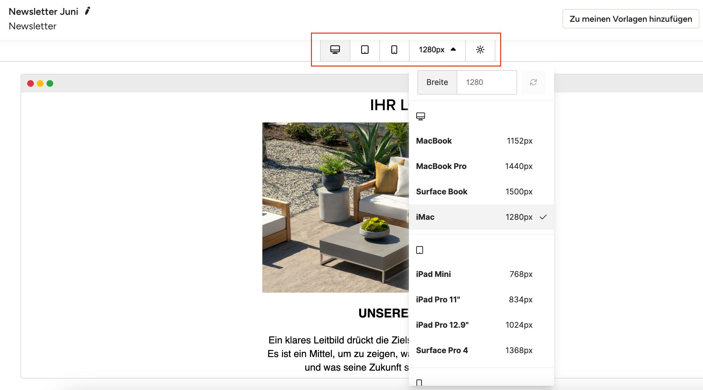Um eine Vorschau der E-Mail anzuzeigen, ohne dass der Vorlageneditor im Weg ist, klicken Sie auf das Vorschau-Icon (Auge) unten links auf der Seite. Hier können Sie sehen, wie die E-Mail auf einer Vielzahl gängiger Geräte aussehen wird. Verwenden Sie die Gerätesymbole, um zwischen den Ansichten zu wechseln, oder verwenden Sie das Dropdown-Menü, um ein bestimmtes Gerät auszuwählen.