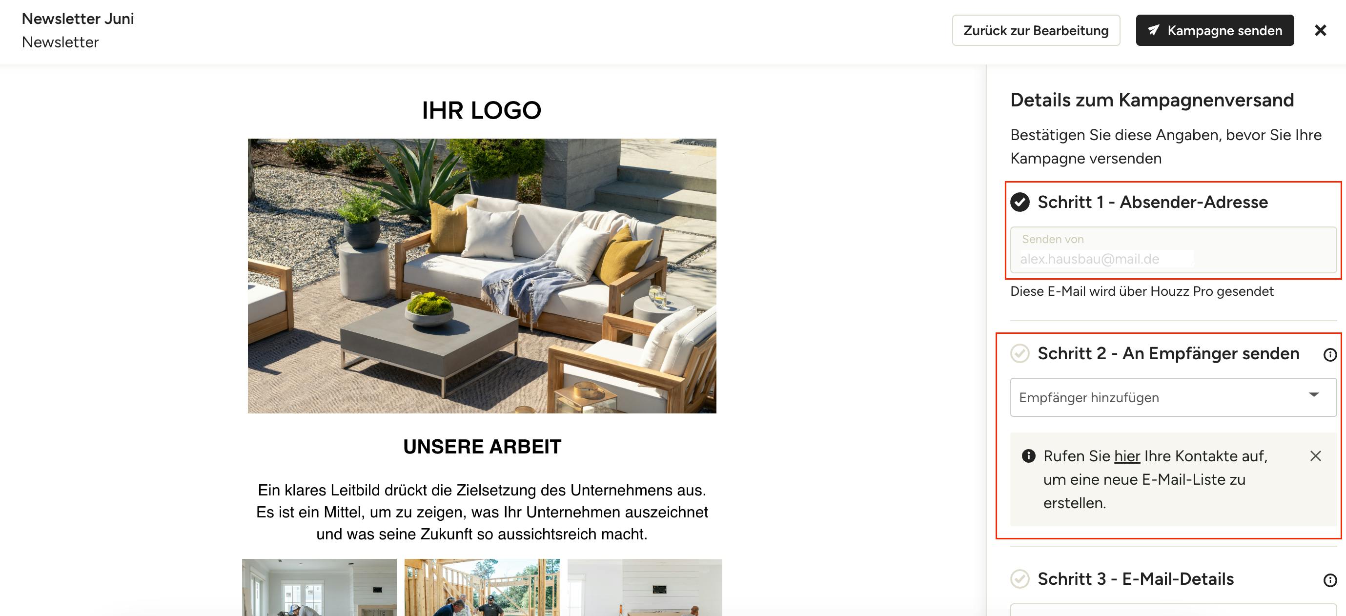 Sie sehen in Schritt 1 der Details zum Kampagnenversand dass die Kampagne von Ihrer geschäftlichen Houzz Pro-Mailadresse über Houzz Pro verschickt wird.