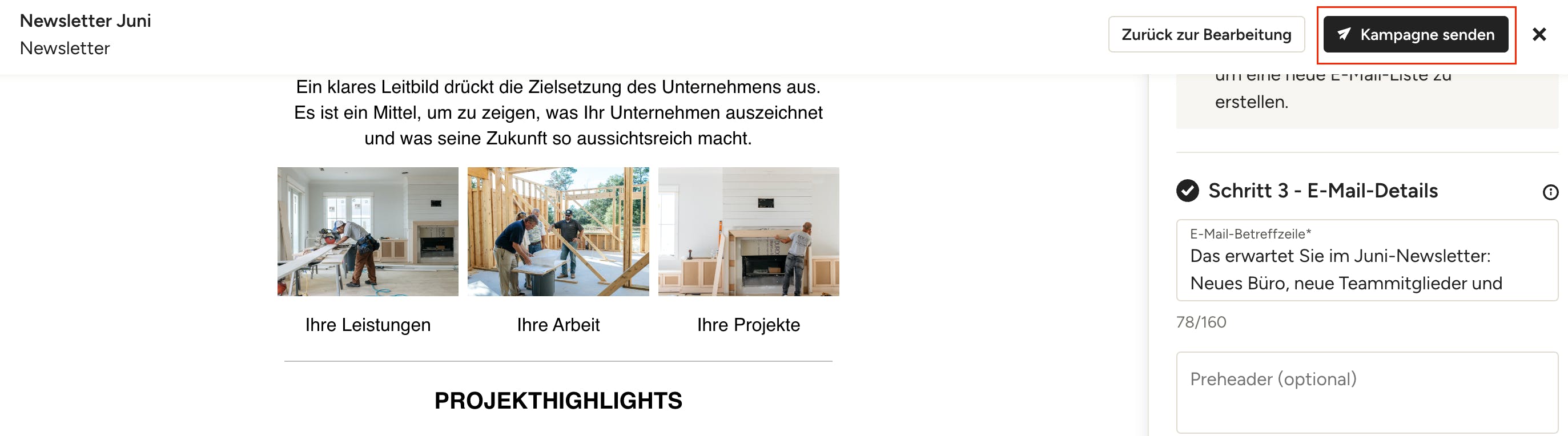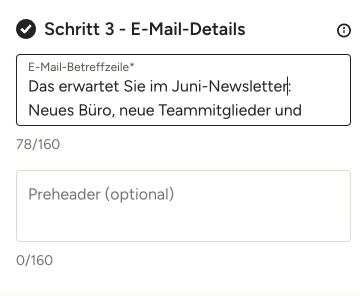 Geben Sie in Schritt 3 eine Betreffzeile und nach Wunsch einen Preheader ein.