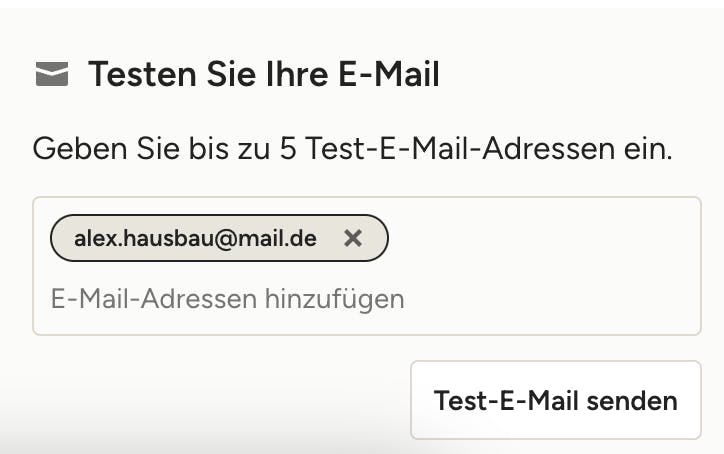 Bevor Sie Ihre Kampagne versenden, können Sie Ihre E-Mail testen, indem Sie bis zu 5 Test-E-Mail-Adressen eingeben und auf „Test-E-Mail senden“ klicken. Sie und Ihr Team werden die Kampagne genauso erhalten wie Ihre Zielgruppe. Prüfen Sie sie also genau und nehmen Sie bei Bedarf Änderungen im Editor vor.